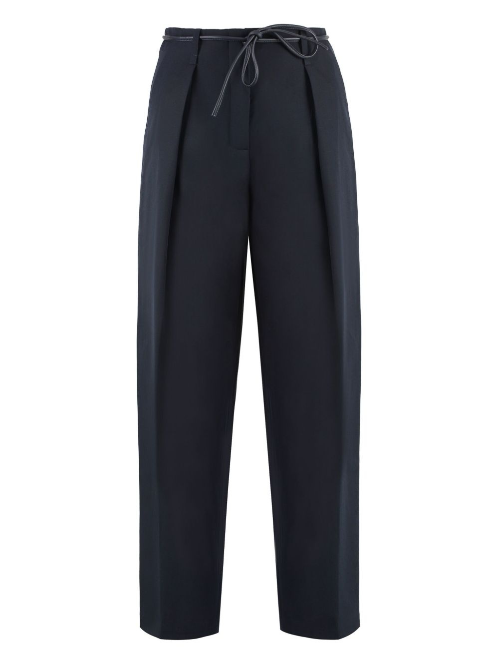 belted trousers Highlights - Navy blue - Concealed front fastening - Self-tie fastening - Pleat detailing - Two rear welt pockets Made in France Composition Polyester 55%, Wool 45%
