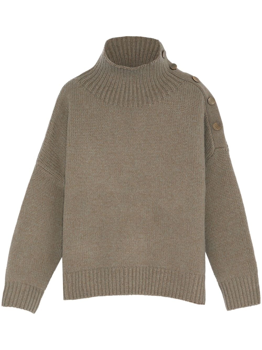 button-up shoulder jumper Highlights - Taupe grey - Wool-cashmere blend - Knitted construction - Button fastening at the shoulder - Ribbed trim - High neck - Long sleeves Made in France Composition Wool 70%, Cashmere 30% SIZE & FIT FittingInformation Designed to be unstructured, offering a loose fit throughout Made with a midweight knit, this piece offers some stretch