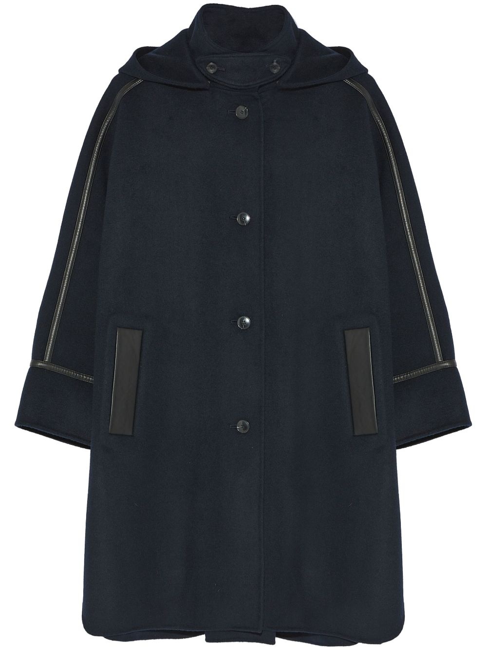 cashmere-blend hooded cape Highlights - Midnight blue - Cashmere blend - Detachable hood - Front button fastening - Leather trim - Long sleeves - Two side welt pockets - Straight hem Made in France Composition Lambs Wool 90%, Cashmere 10%