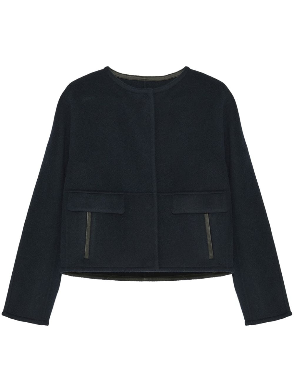 cashmere jacket Highlights - Midnight blue - Wool-cashmere blend - Front button fastening - Leather trim - Round split neck - Two side flap pockets - Cropped Made in France Composition Lamb Skin 100%, Wool 90%, Cashmere 10%