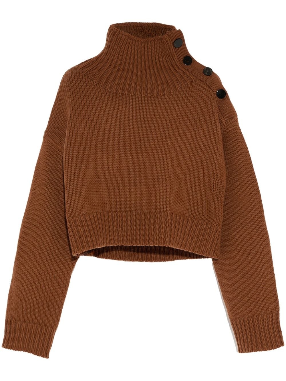 cropped knit jumper Highlights - Brown - Wool-cashmere blend - Knitted construction - Side button fastening - High neck - Long sleeves - Ribbed cuffs and hem - Straight hem - Cropped Made in France Composition Lambs Wool 70%, Cashmere 30%