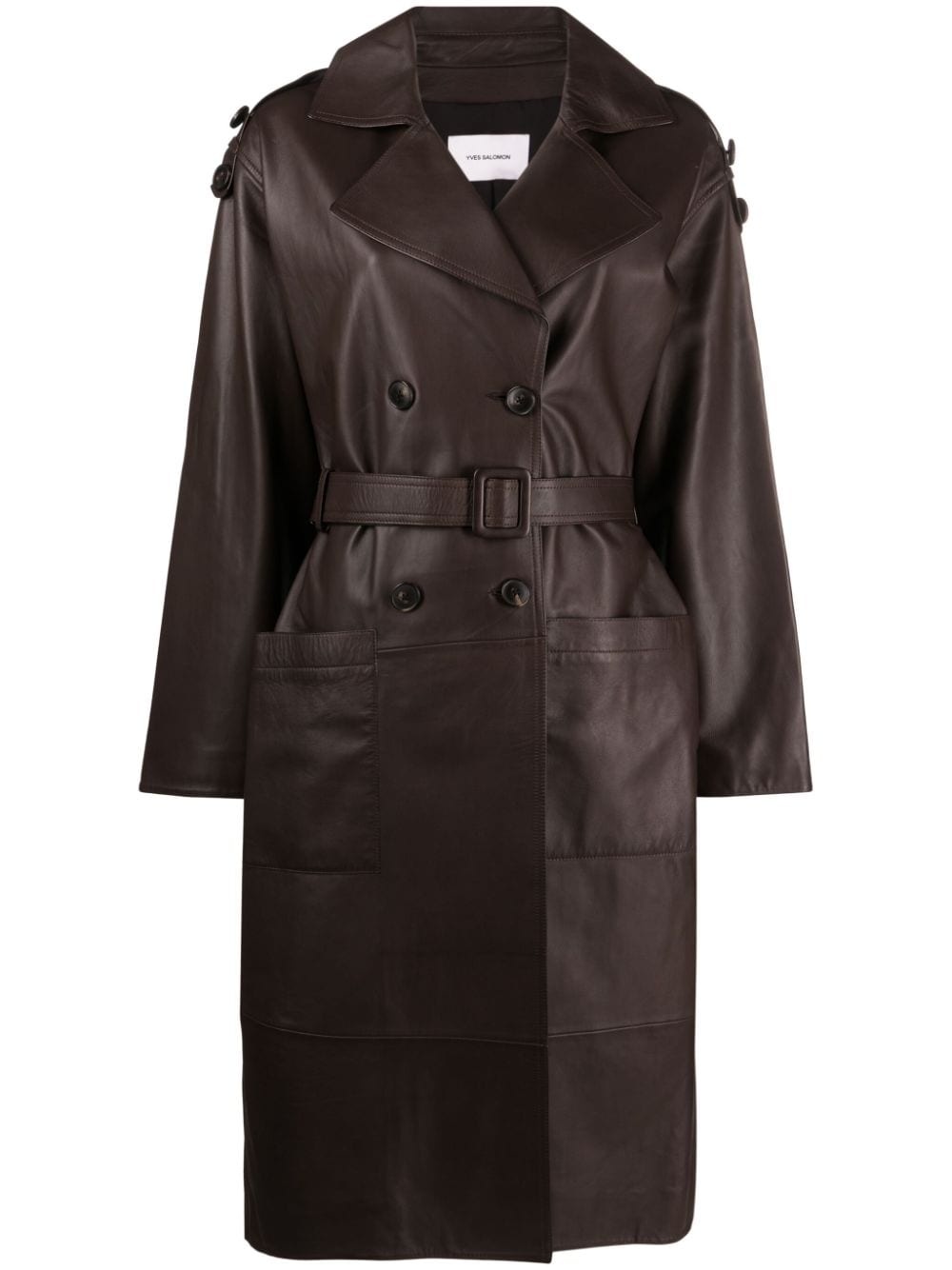 double-breasted leather trench coat Highlights - Chocolate brown - Lambskin - Epaulettes - Spread collar - Double-breasted button fastening - Belted waist - Long sleeves - Two front patch pockets - Mid-length Made in France Composition Outer: Lamb Skin 100% Lining: Polyester 100% SIZE & FIT Model measurements Height 5 ft 10 in(1.79 m) Bust/Chest 33.07 in(84 cm) Hips 35.82 in(91 cm) Waist 24.01 in(61 cm) FittingInformation Designed to be unstructured, offering a loose fit throughout The belt offers adjustability for fitted preferences Soft leather has a supple and smooth construction offering some flexibility This piece fits true to size – take your usual size Washing instructions Specialist Cleaning