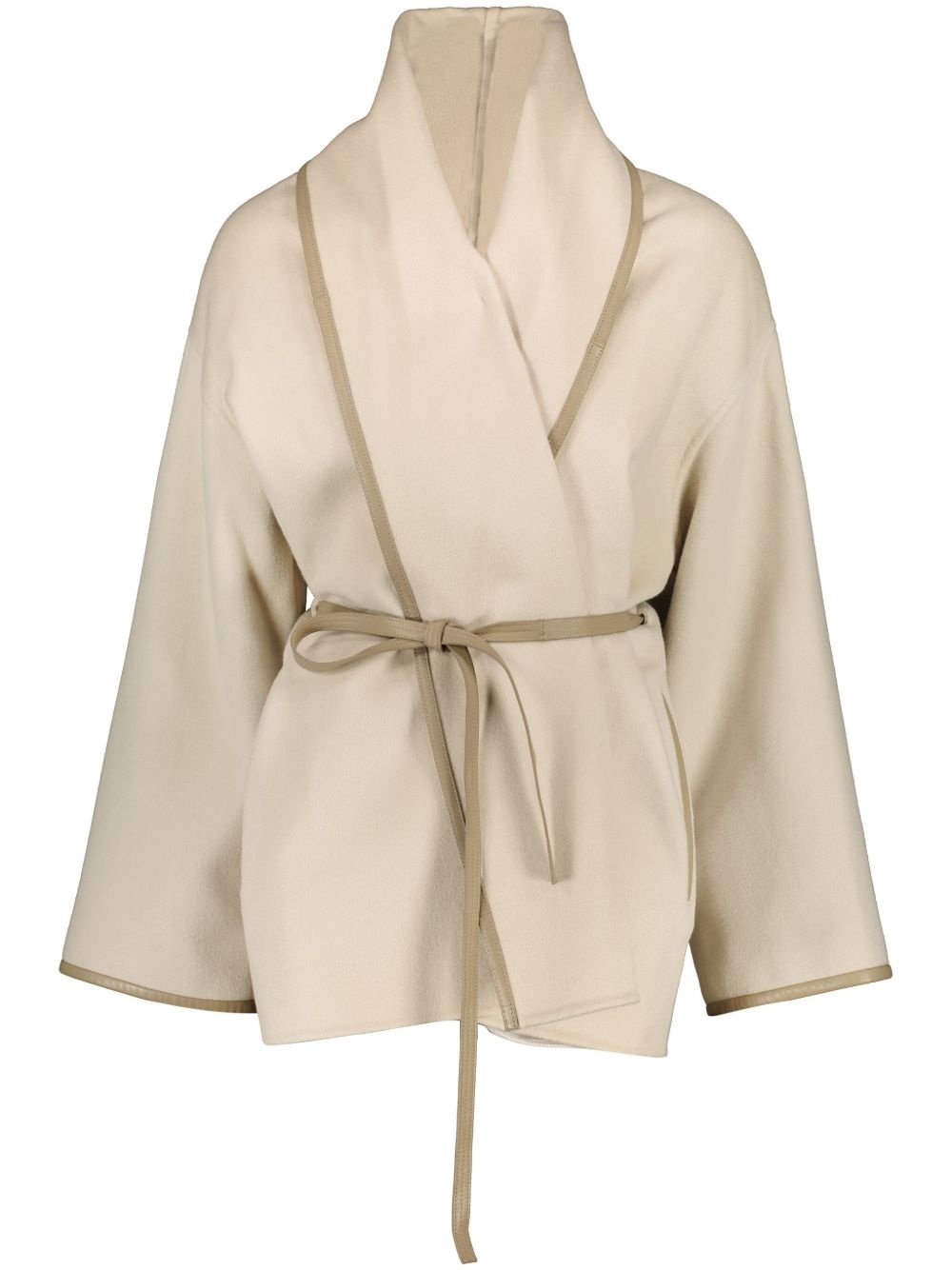 double-sided jacket Highlights - Light beige - Detachable adjustable waist strap - Two side welt pockets - Contrasting trim Made in France Composition Wool 81%, Cashmere 10%, Lamb Skin 9%