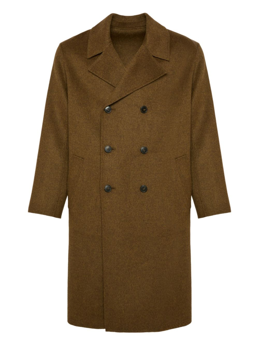 double-sided wool-cashmere coat Highlights - Brown - Double-breasted - Button fastening - Notched lapels - Long sleeves - Welt pockets Made in France Composition Outer: Organic Wool 90%, Cashmere 10% Lining: Cupro 100%