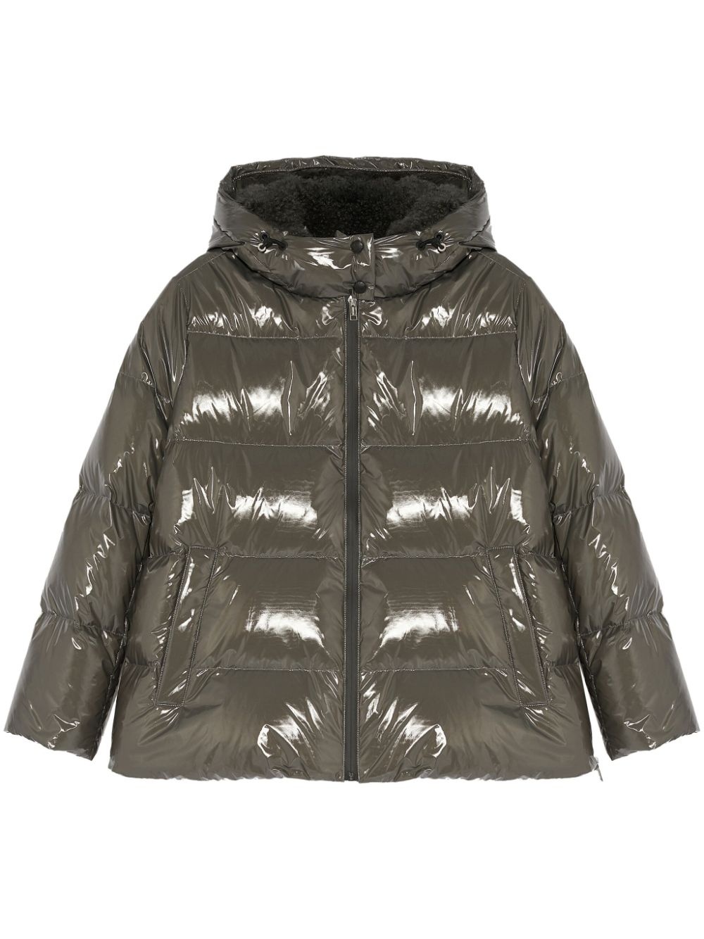 duck-down padded jacket Highlights - Grey - Lambskin trim - Duck down - Padded design - Front zip fastening - Side zip fastening - Press-stud placket - Glossy finish - Classic hood - Two side welt pockets Made in France Composition Outer: Fabric 60%, Polyester 20%, Lamb Fur 20% Lining: Duck Down 95%, Duck Feathers 5%