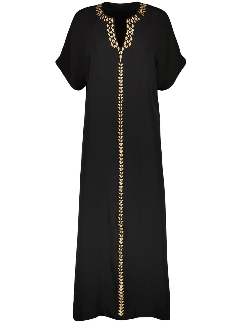 embroidered silk dress Highlights - Black - Pull-on style - V-neck - Short sleeves - Long length Made in France Composition Silk 100%