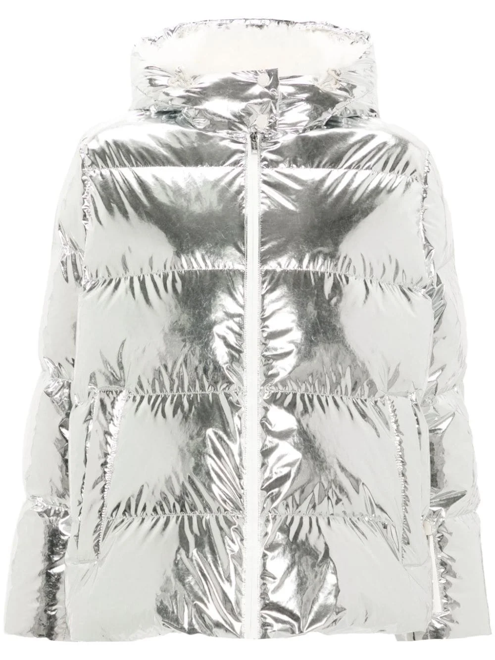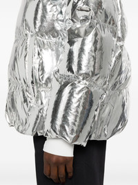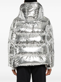 hooded puffer jacket Highlights - Silver-tone - Duck down - Padded design - Metallic finish - Logo patch at the sleeve - Drawstring hood - Front zip fastening - Long sleeves - Long sleeves with thumbhole cuffs - Two side zip-fastening pockets - Zip-fastening side slits - Straight hem - Internal shoulder straps - Shearling lining at the hood Imported Composition Lining: Polyamide 100%, Duck Down 95%, Duck Feathers 5% Outer: Polyester 100%, Lamb Fur 100% SIZE & FIT Model measurements Height 5 ft 10 in(1.77 m) Bust/Chest 32.28 in(82 cm) Hips 35.03 in(89 cm) Waist 25.19 in(64 cm) FittingInformation Designed for a relaxed fit, this piece allows for comfort and movement when worn The internal drawstring at the hem allows for fitted preferences Made from a padded non-stretch fabric, giving it no natural elasticity This piece fits true to size – take your usual size