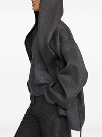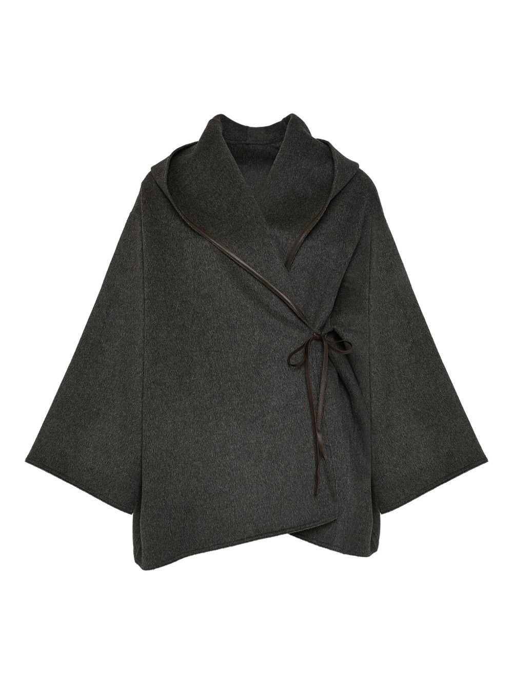 hooded wrap coat Highlights - Charcoal grey - Wrap front - Leather tie fastening - Hooded neckline - Wide sleeves - Double-sided wool blend Made in France Composition Outer: Lamb Skin 100%, Organic Wool 90%, Cashmere 10% Washing instructions Read Manufacturer Guidelines