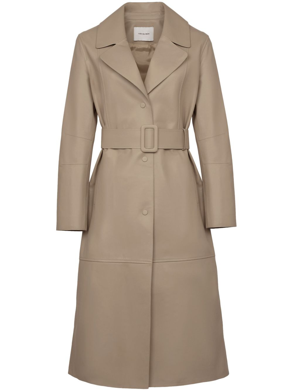 leather trenchcoat Highlights - Sand beige - Front press-stud fastening - Two side slit pockets - Belted waist Made in France Composition Lambskin 100%, Viscose 57%, PBT Elite 43% Washing instructions Specialist Cleaning