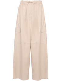 leather trousers Highlights - Almond beige - Elasticated drawstring waistband - Two side slit pockets - Two rear patch pockets - Wide leg Made in France Composition Lambskin 100% Washing instructions Read Manufacturer Guidelines