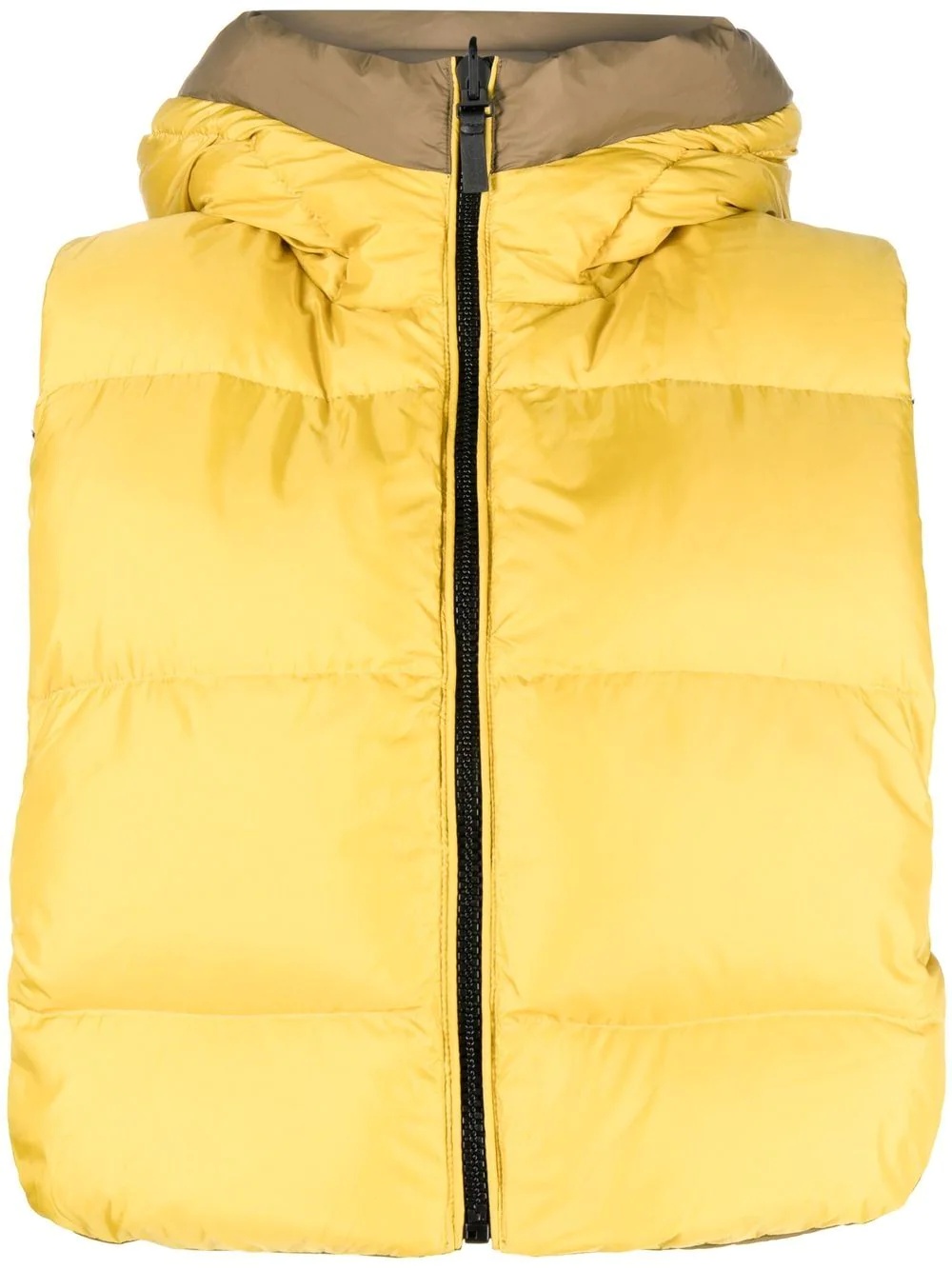 logo-print reversible padded gilet ginger/military green feather down padded design reversible logo print to the rear internal logo patch cropped drawstring hood front zip fastening side slits sleeveless straight hem Made in France Composition Outer: Polyester 100% Lining: Polyamide 100%, Feather Down 100% SIZE & FIT Model measurements Height 5 ft 10 in(1.77 m) Bust/Chest 34.64 in(88 cm) Hips 35.43 in(90 cm) Waist 24.8 in(63 cm) FittingInformation This piece fits true to size. We recommend you get your regular size Cut for a slim fit Made with a lightweight non-stretch fabric Washing instructions Dry Clean Only