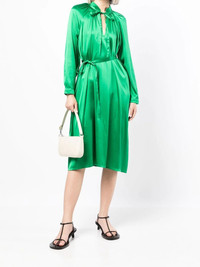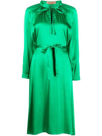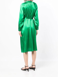 satin-finish tied-waist dress emerald green silk satin finish tied waist round neck front tie fastening long sleeves mid-length Made In France Composition Body: Silk 100% SIZE & FIT Model measurements Height 5 ft 10 in(1.78 m) Bust/Chest 28.34 in(72 cm) Hips 35.43 in(90 cm) Waist 23.62 in(60 cm) FittingInformation This piece fits true to size. We recommend you get your regular size Cut for a loose fit. Comes with an adjustable belt for a flexible fit at the waist Made with a lightweight fabric Washing instructions Dry Clean Only