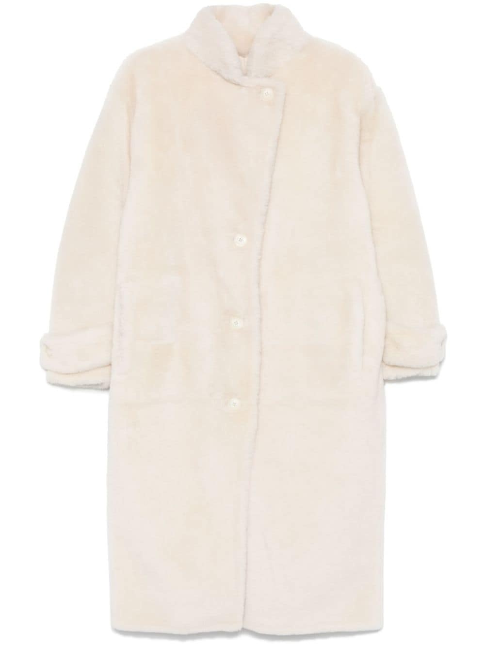 shearling coat Highlights - White - Shearling - Front button fastening - Stand-up collar - Long sleeves - Buttoned strap to the cuffs - Two side welt pockets - Leather lining - Straight hem - Mid-calf length Made in France Composition Outer: Lamb Fur 100% Lining: Lamb Skin 100% Washing instructions Specialist Cleaning