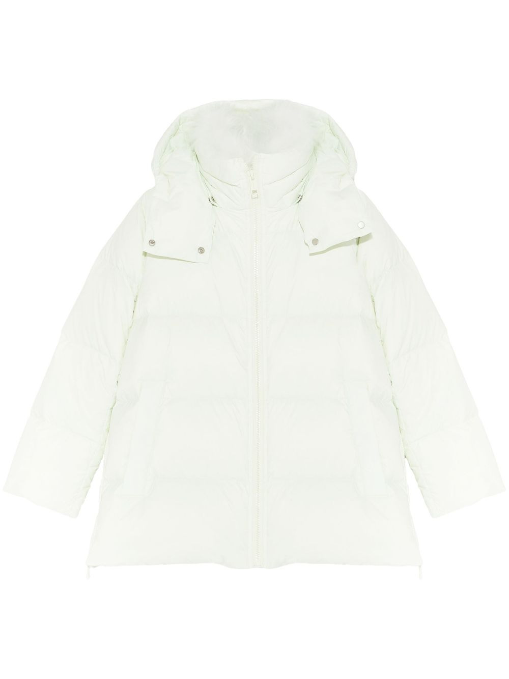 shearling-trimmed down jacket Highlights - Light green - Down-feather filling - Quilted - Water-repellent - Front zip fastening - Detachable hood - Stand-up collar - Shearling trim - Long sleeves - Two side welt pockets - Side slits - A-line - Straight hem Made in France Composition Outer: Polyamide 90%, Lambs Wool 10% Lining: Duck Down 95%, Duck Feathers 5%