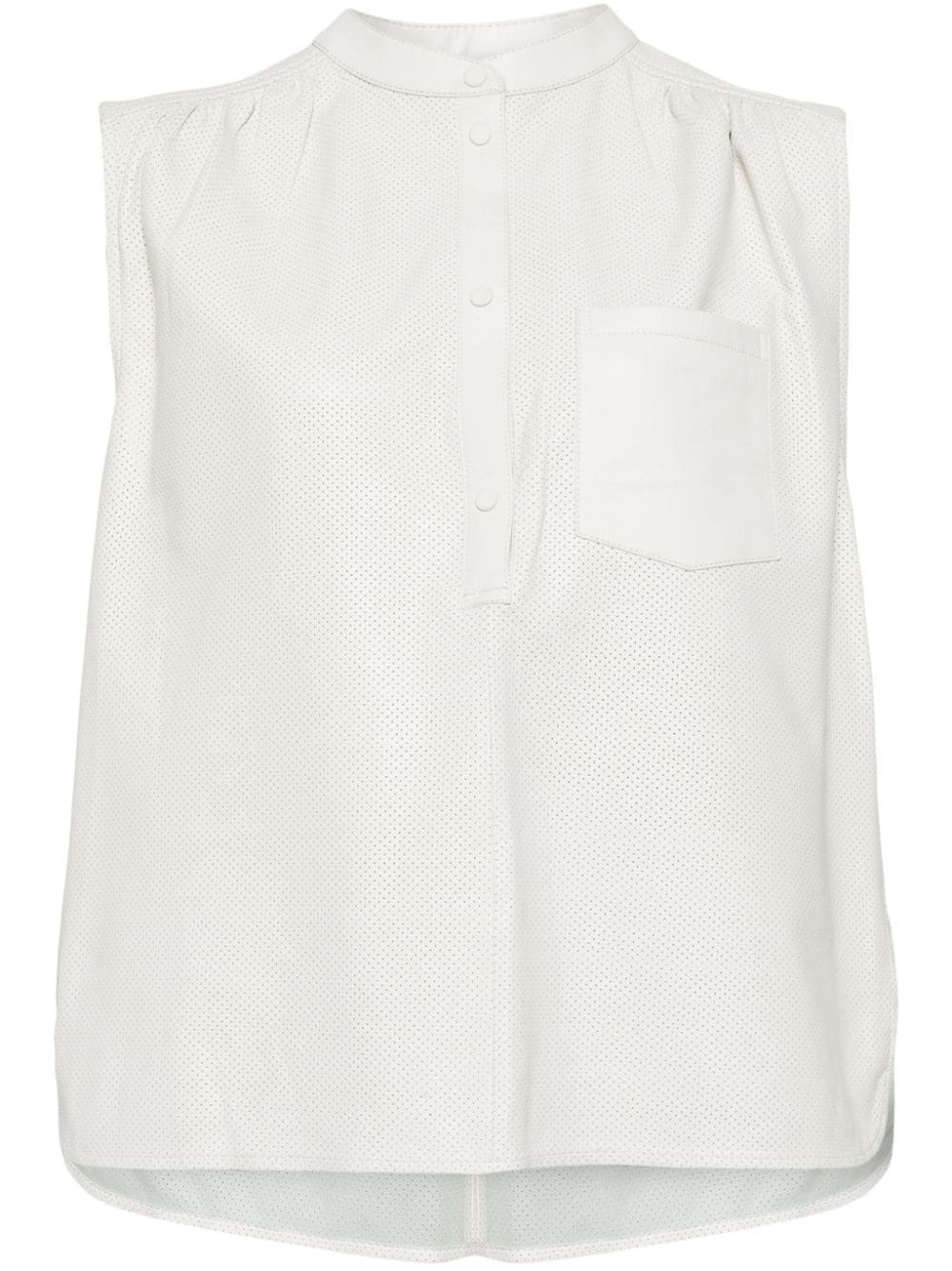 sleeveless leather blouse Highlights - White - Lambskin - Open-work dial - Band collar - Sleeveless - Chest patch pocket - Rear curved hem - Short front press-stud fastening Made in France Composition Lamb Fur 100%