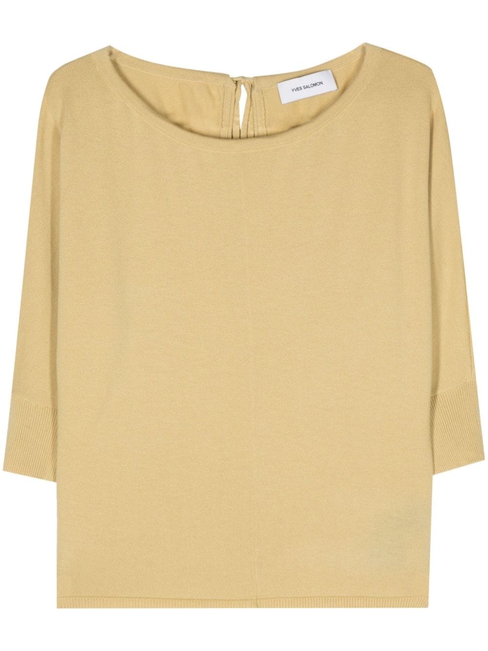 tie-fastening wool knitted top Highlights - Medium yellow - Wool - Knitted construction - Draped detailing - Round neck - Three-quarter length sleeves - Straight hem - Rear tie fastening Imported Composition Wool 100%