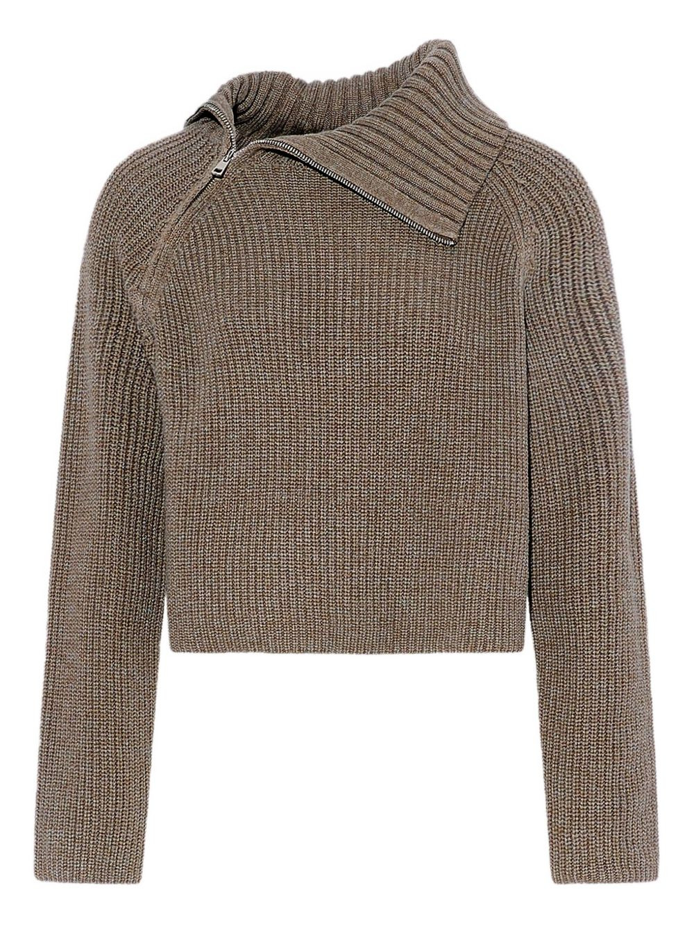 zip-neck ribbed sweater Highlights - Grey - Ribbed knit - Asymmetric zip fastening - High neck - Raglan sleeves - Cropped lenght Made in France Composition Wool 70%, Cashmere 30% Washing instructions Read Manufacturer Guidelines