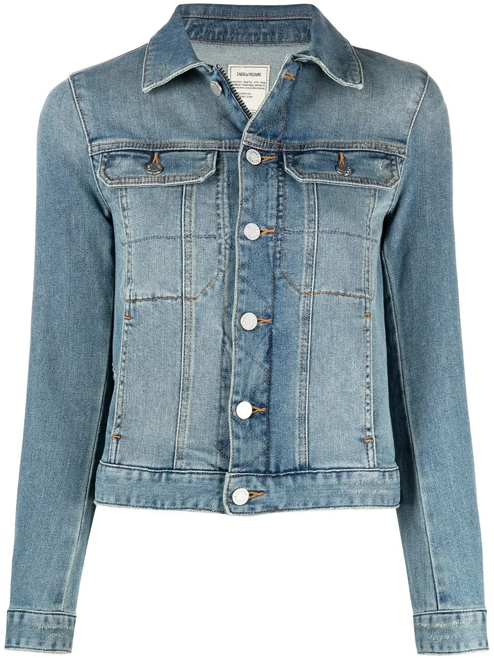 button-front denim jacket Blue button-front denim jacket from ZADIG&VOLTAIRE featuring a pointed collar, a front button fastening, long sleeves, front flap pockets and a distressed finish. Made in Italy Composition Cotton 98%, Spandex/Elastane 2% SIZE & FIT Model measurements Height 5 ft 10 in(1.78 m) Bust/Chest 31.88 in(81 cm) Hips 35.82 in(91 cm) Waist 24.4 in(62 cm) FittingInformation This piece fits true to size. We recommend you get your regular size Cut for a slim fit Made with a mid-weight stretch fabric Washing instructions Machine Wash