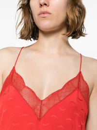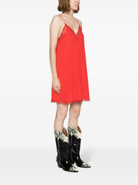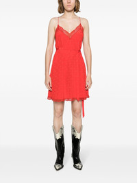 Christy Jac wings-motif lace-trim silk dress Zadig&Voltaire's Christy dress is a romantic take on classic silhouettes. Crafted from fluid red silk to a V-neck silhouette, it’s traced with delicate floral lace. Highlights - Bright red - Silk - Lace trim - All-over wings embroidery - Detachable waist belt - V-neck - Spaghetti straps - Flared hem Imported Composition Silk 100%, Polyamide 74%, Elastane 26% SIZE & FIT Model measurements Height 5 ft 10 in(1.79 m) Bust/Chest 32.67 in(83 cm) Hips 34.25 in(87 cm) Waist 24.4 in(62 cm) FittingInformation Designed to be unstructured, offering a loose fit throughout The adjustable tie waist gives a more adaptable and personalised fit Made from a lightweight non-stretch fabric This piece fits true to size – take your usual size Washing instructions Hand Wash
