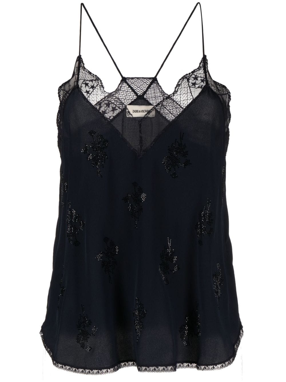 Christy rhinestone-embellished silk top Highlights - Midnight blue - Silk - Lace trim - Rhinestone embellishment - Spaghetti straps - V-neck - Curved hem Imported Composition Lining: Polyamide 74%, Spandex/Elastane 26% Outer: Silk 100%, Polyamide 100% SIZE & FIT Model measurements Height 5 ft 10 in(1.79 m) Bust/Chest 32.67 in(83 cm) Hips 34.25 in(87 cm) Waist 24.4 in(62 cm) FittingInformation Designed for a relaxed fit, this piece allows for comfort and movement when worn Made from a lightweight non-stretch fabric This piece fits true to size – take your usual size Washing instructions Hand Wash