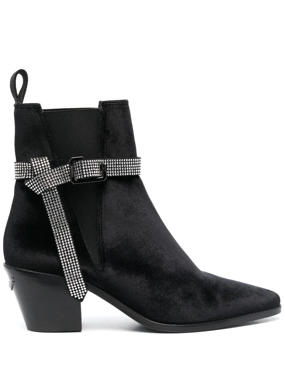 crystal-embellished 70mm velvet boots black calf leather velvet elasticated side panels round toe 70mm mid block heel Imported Composition Sole: Calf Leather 100% Lining: Calf Leather 100% Outer: Velvet 100%