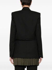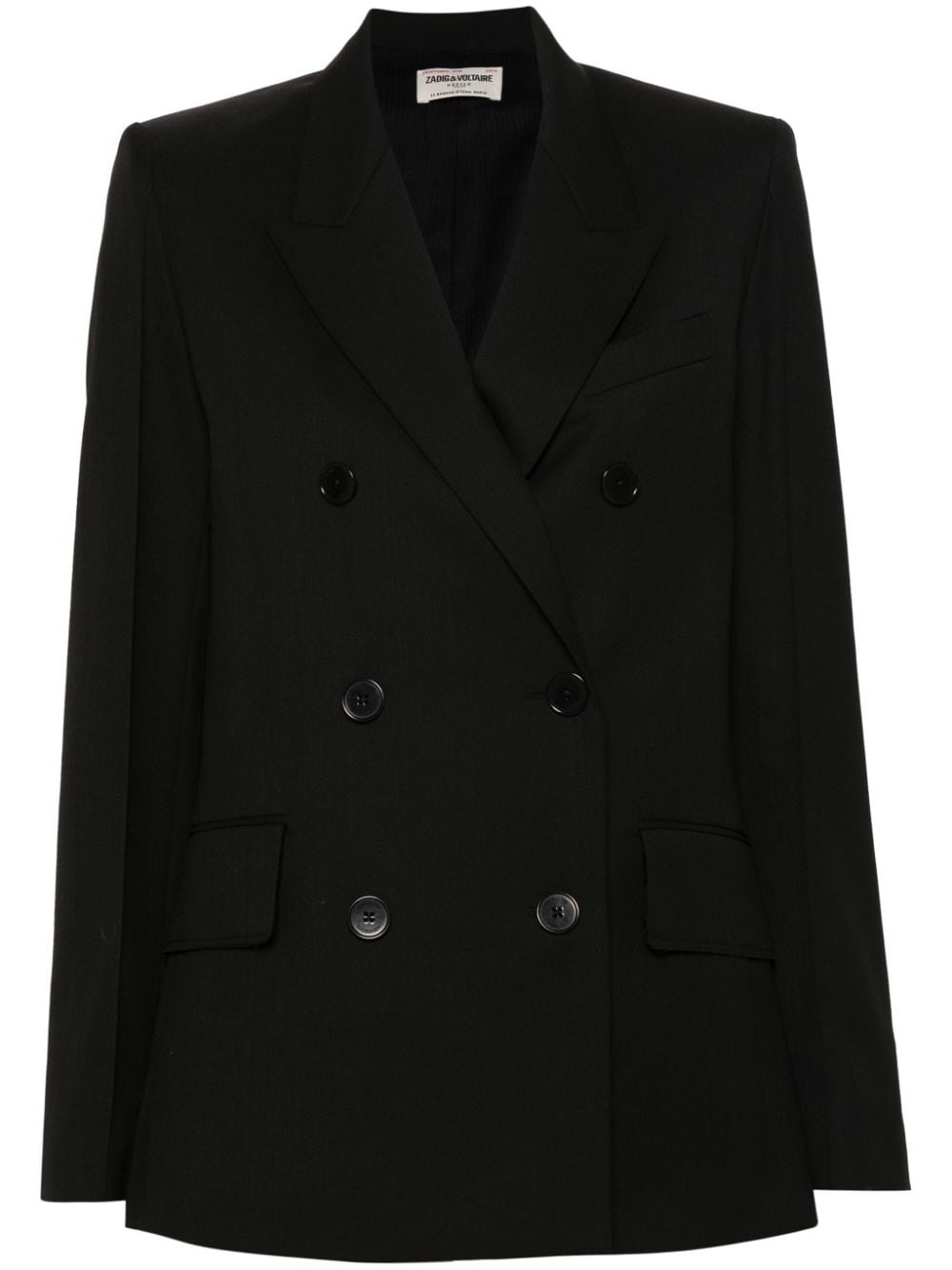 double-breasted blazer This black Zadig&Voltaire blazer looks like a classic double-breasted style from the front, but it turns to reveal a layered panel at the back that resembles the look of storm flaps. Padded shoulders add structure to the loose silhouette. Highlights - Black - Interlock twill weave - Peak lapels - Shoulder pads - Long sleeves - Buttoned cuffs - Faux pocket detail - Two front flap pockets - Layered panel to the rear - Striped lining - Double-breasted button fastening Imported Composition Outer: Polyester 55%, Virgin Wool 45% Lining: Cotton 100%, Acetate 53%, Viscose 47% SIZE & FIT Model measurements Height 5 ft 11 in(1.8 m) Bust/Chest 33.07 in(84 cm) Hips 37 in(94 cm) Waist 25.59 in(65 cm) FittingInformation Designed to be unstructured, offering a loose fit throughout The internal shoulder pads offer a structured shape Made from a midweight non-stretch fabric This piece fits true to size – take your usual size