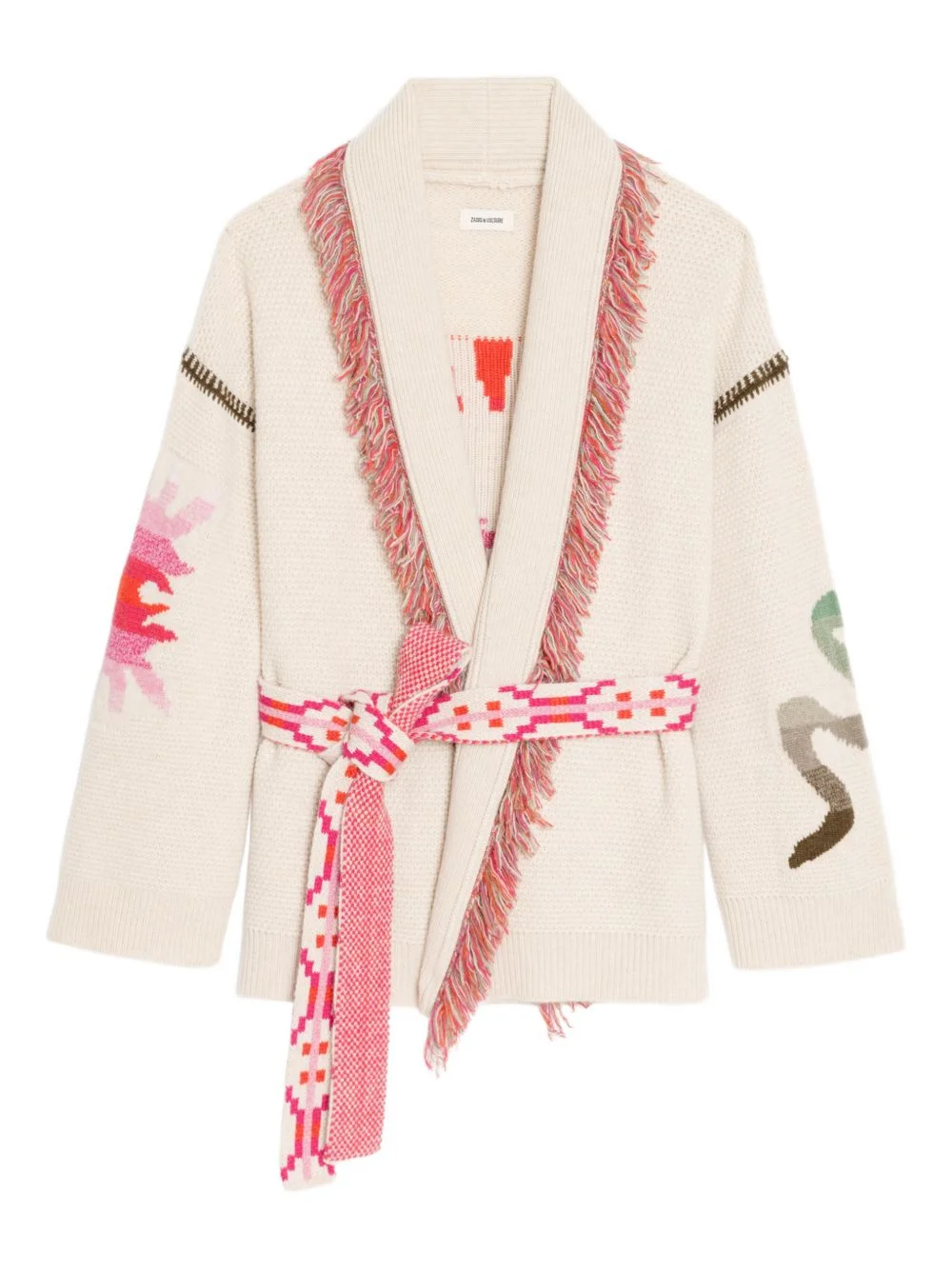 fringed belted cardigan Highlights - Cream - Fringe trim - Belt - Graphic print - Long sleeves Imported Composition Wool 90%, Cashmere 10% Washing instructions Hand Wash