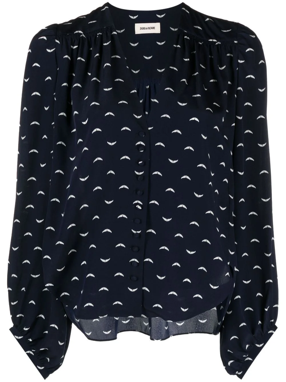 graphic-print long-sleeved blouse Highlights - Navy blue/milk white - Silk - All-over graphic print - V-neck - Front button fastening - Long sleeves - Buttoned cuffs - Curved hem Imported Composition Silk 100% SIZE & FIT Model measurements Height 5 ft 10 in(1.78 m) Bust/Chest 31.49 in(80 cm) Hips 35.03 in(89 cm) Waist 23.62 in(60 cm) FittingInformation Designed for a relaxed fit, this piece allows for comfort and movement when worn Made from a lightweight non-stretch fabric This piece fits true to size – take your usual size Washing instructions Hand Wash