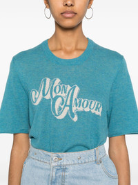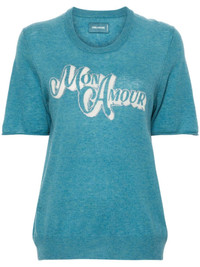 Ida crystal-embellishment knitted top Highlights - Aqua blue/cream white - Cashmere - Ribbed knit - Melange effect - "mon amour" intarsia-knit with crystal embellishment - Crew neck - Short sleeves - Straight hem - Unlined Imported Composition Cashmere 100% SIZE & FIT Model measurements Height 5 ft 9 in(1.76 m) Bust/Chest 31.1 in(79 cm) Hips 36.61 in(93 cm) Waist 24.8 in(63 cm) FittingInformation Designed to be unstructured, offering a loose fit throughout Made with a lightweight knit, this piece offers some stretch This piece fits true to size – take your usual size