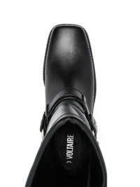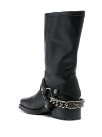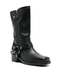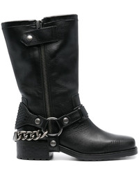 Igata leather biker boots Zadig&Voltaire's Igata boots are modelled after classic biker styles. They’re crafted from black leather to a square-toe silhouette and emboldened with straps, rings and zigzag stitching. A signature wings plaque is suspended along the chain-link strap that wraps around the low stacked heel. Highlights - Black - Calf leather - Low stacked heel - Decorative stitching - Strap detailing - Ring embellishment - Chain-link detailing - Signature wing logo plaque - Square toe - Branded leather insole - Rubber sole - Side press-stud and zip fastening Imported Composition Sole: Rubber 100%, Calf Leather 100% Outer: Calf Leather 100% Lining: Calf Leather 100% SIZE & FIT Measurement CIRCUMFERENCE 12.99 in(33 cm) HEEL 1.57 in(4 cm) HEIGHT 9.84 in(25 cm) Sole height 0.39 in(1 cm)