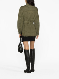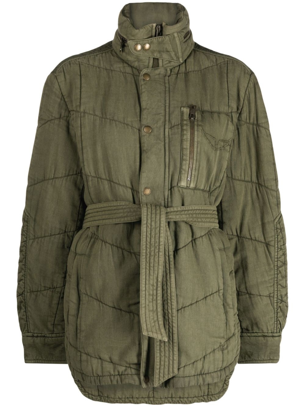 Kalice belted quilted jacket Zadig&Voltaire's Kalice jacket mirrors the brand’s utilitarian inspiration. It’s made from durable organic cotton to a quilted construction anchored with an adjustable belt. The chest patch pocket is fitted with a functional zip and embroidered with the brand’s distinctive logo. Highlights - Green - Organic cotton - Embroidered logo at the chest - Funnel neck - Front button fastening - Belted waist - Long sleeves - Zip-fastening chest pocket - Two side welt pockets - Curved hem Imported Composition Outer: Organic Cotton 100% Lining: Polyester 100% SIZE & FIT Model measurements Height 5 ft 10 in(1.78 m) Bust/Chest 31.49 in(80 cm) Hips 35.03 in(89 cm) Waist 23.62 in(60 cm) FittingInformation Designed to be unstructured, offering a loose fit throughout The tie fastening gives an adaptable and personalised fit Made from a midweight non-stretch fabric This piece fits true to size – take your usual size Washing instructions Dry Clean Only