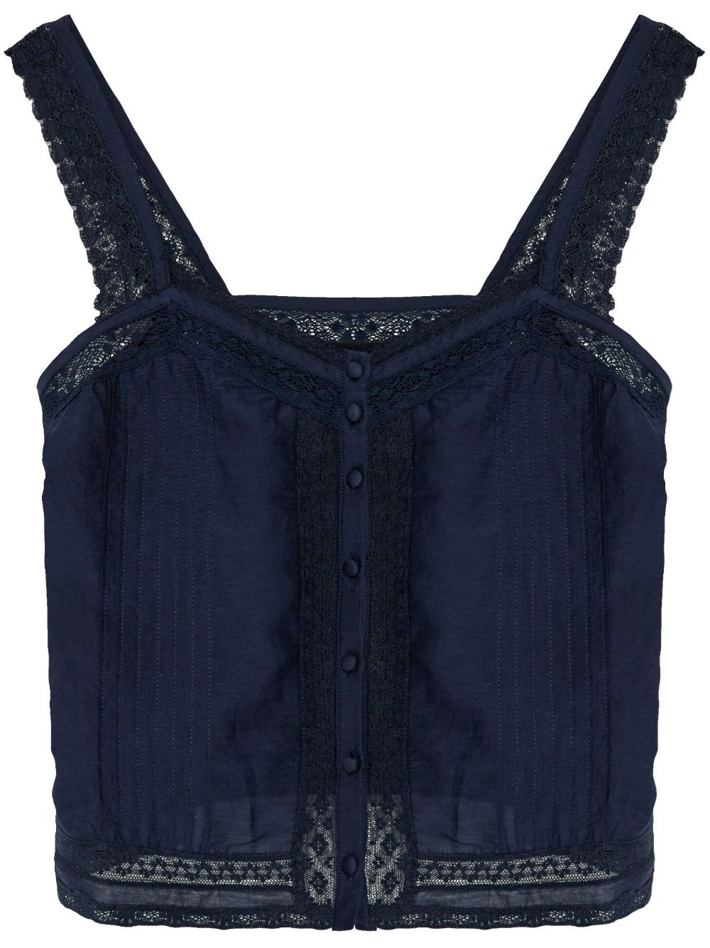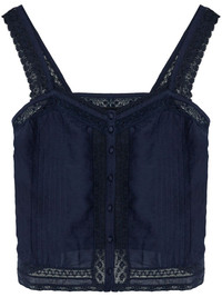 lace-trimmed tank top Highlights - Midnight blue - Front button fastening - Bustier-style neckline - Wide shoulder straps - Lace trim Imported Composition Cotton 75%, Viscose 25% Washing instructions Read Manufacturer Guidelines