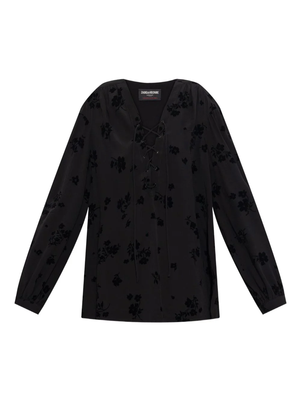 lace-up blouse Highlights - Black - Floral pattern - Lace-up detailing - Long sleeves - V-neckline Imported Composition Viscose 100% Washing instructions Machine Wash