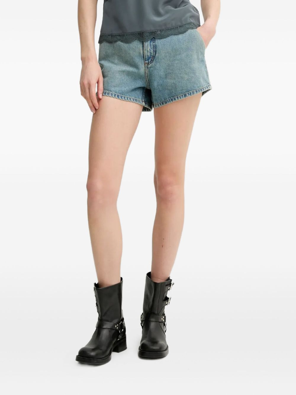 logo-plaque denim shorts Highlights - Light blue - Button fly - Leather logo patch - Back jetted pockets Imported Composition Cotton 100% Washing instructions Read Manufacturer Guidelines