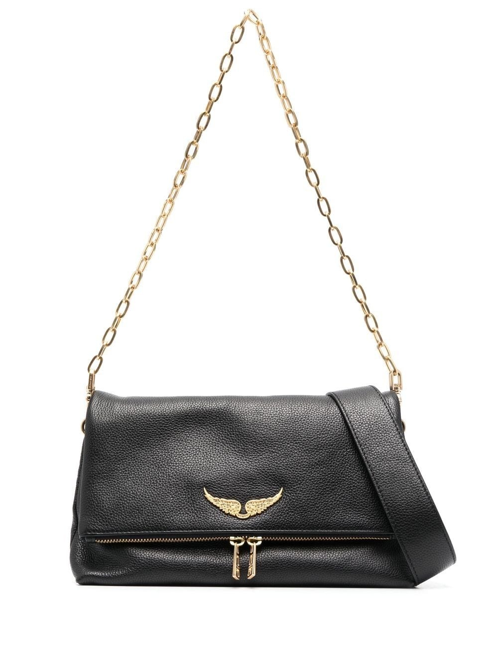 logo-plaque leather shoulder bag Defined by the iconic wing plaque in an elegant gold tone, this shoulder bag is imagined by Zadig&Voltaire in a classic black hue. The chain strap adds an edgy touch to the grained accessory. Imported Composition Outer: Calf Leather 100% Lining: Cotton 100% SIZE & FIT Model measurements Height 5 ft 11 in(1.8 m) Bust/Chest 33.07 in(84 cm) Hips 37.4 in(95 cm) Waist 25.19 in(64 cm) Measurement STRAP 12.99 in(33 cm) DEPTH 4.33 in(11 cm) WIDTH 10.62 in(27 cm) HEIGHT 6.29 in(16 cm)