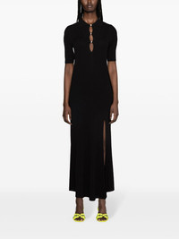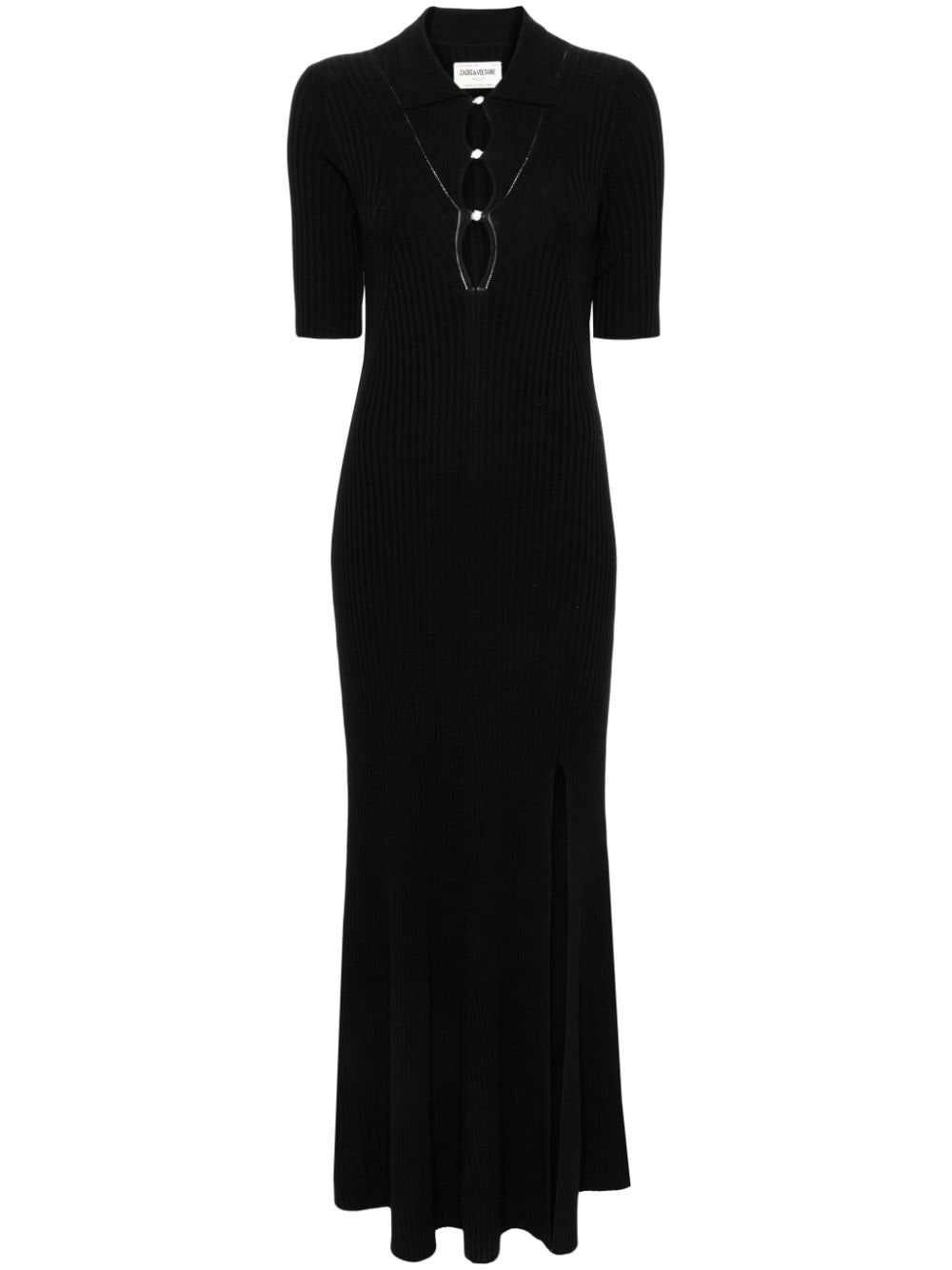 Lysa ribbed-knit maxi dress Zadig&Voltaire's Lysa dress speaks to the brand's effortless aesthetic with its ribbed-knit construction. Crystal-embellished buttons add a refined appeal. Highlights - Black - Merino wool blend - Ribbed knit - Cut-out detailing - Polo collar - Crystal-embellished buttons - Short front button fastening - Short sleeves - Fitted waistline - Front slit - Flared hem - Ankle-length Imported Composition Merino 90%, Polyester 10% SIZE & FIT Model measurements Height 5 ft 11 in(1.8 m) Bust/Chest 34.25 in(87 cm) Hips 35.82 in(91 cm) Waist 24.8 in(63 cm) FittingInformation Designed for a slim fit that sits just away from the body offering a close yet comfortable fit The vented hem offers movement at the rear Made from a midweight non-stretch fabric, this piece offers minimal elasticity when worn This piece fits true to size – take your usual size Washing instructions Hand Wash