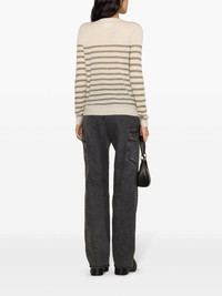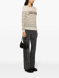 Mon Amour striped jumper Zadig&Voltaire steps away from its usual rock and roll spirit to present this jumper. It's spun from cashmere and embellished with a Mon Amour slogan made out of rhinestones on top of the horizontal stripe pattern. Highlights - Light beige - Cashmere - Fine knit - Horizontal stripe pattern - Logo patch to the front - Rhinestone embellishment - Crew neck - Long sleeves - Ribbed cuffs and hem Imported Composition Cashmere 100% Washing instructions Dry Clean Only