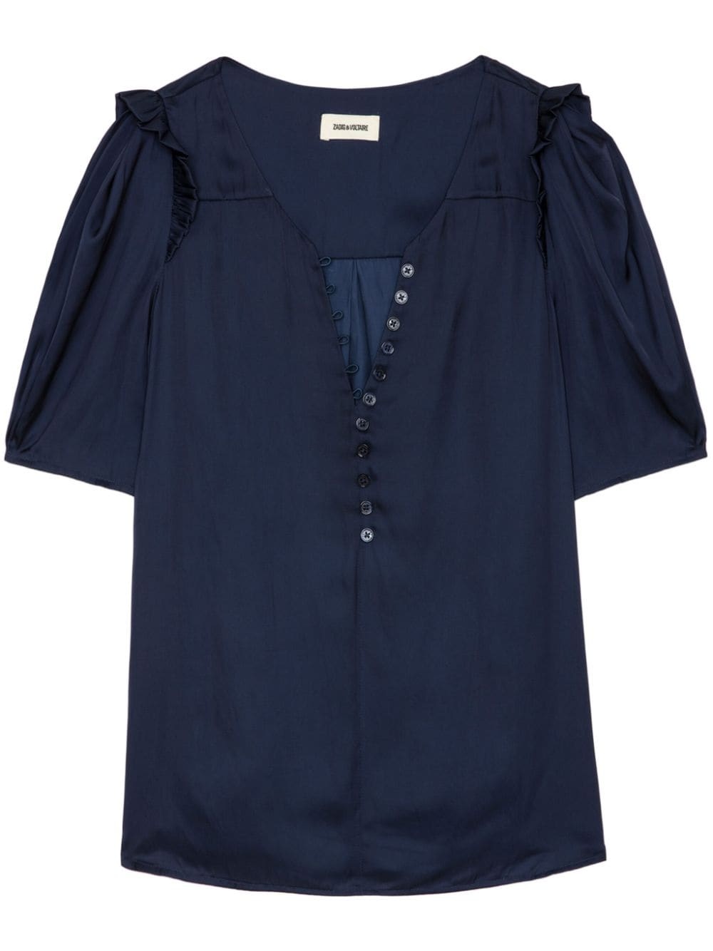 puff-sleeve satin top Highlights - Sailor blue - Satin finish - Short front button fastening - Ruffled detailing - Short puff sleeves - Straight hem Imported Composition Polyester 100% SIZE & FIT FittingInformation Designed for a relaxed fit, this piece allows for comfort and movement when worn Made from a midweight non-stretch fabric This piece fits true to size – take your usual size Washing instructions Read Manufacturer Guidelines