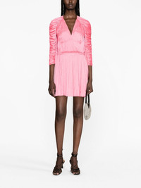 Realine gathered satin-finish minidress Made from lustrous satin-finish fabric in a bubblegum-pink hue, Zadig&Voltaire's Realine minidress is characterised by the elaborate gathering on its bodice and sleeves, which adds a tactile element. It flows into a pleated skirt that creates a sense of movement. Highlights - Bubblegum pink - Recycled polyester blend - Satin finish - Gathered detailing - V-neck - Three-quarter length sleeves - Elasticated waistband - Pleated skirt - Flared hem - Above-knee length Imported Composition Outer: Recycled Polyester 57%, Polyester 43% Lining: Cotton 100% SIZE & FIT Model measurements Height 5 ft 11 in(1.8 m) Bust/Chest 34.25 in(87 cm) Hips 35.82 in(91 cm) Waist 24.8 in(63 cm) FittingInformation Designed to be unstructured, offering a loose fit throughout The elasticated waist allows for a comfortable fit Made from a midweight non-stretch fabric This piece fits true to size – take your usual size Washing instructions Hand Wash