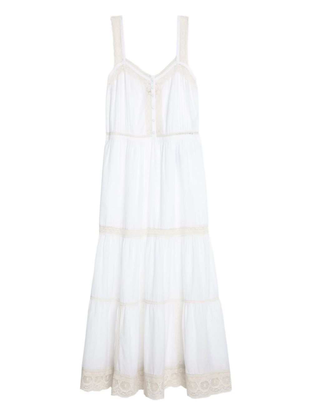 Relite maxi dress Highlights - White - Short front button fastening - Lace detailing - Sleeveless - Tiered skirt Imported Composition Cotton 73%, Viscose 27%