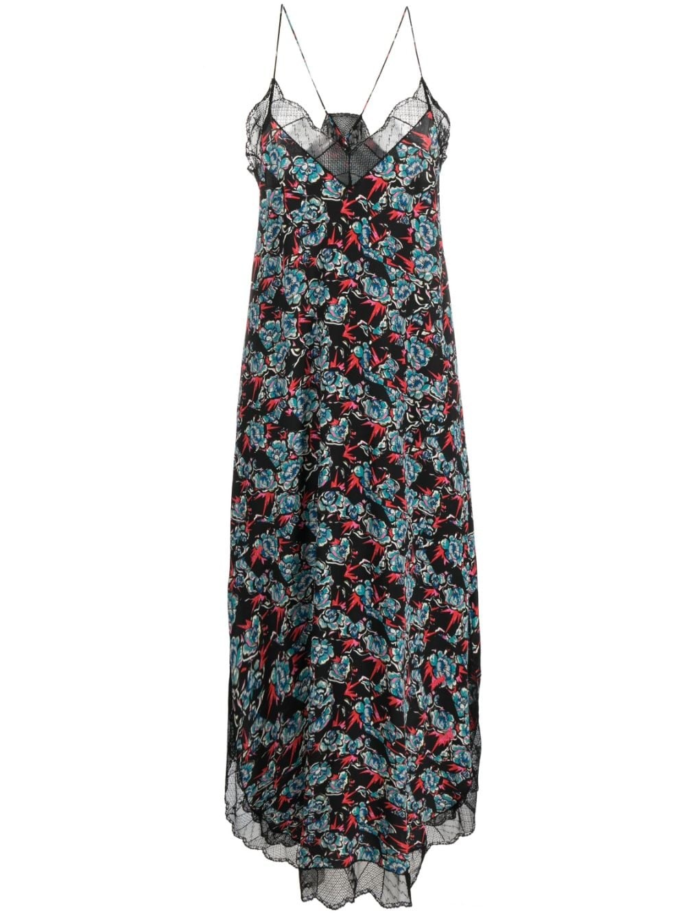 Risty floral-print silk slip dress Zadig&Voltaire's hallmark Risty dress encapsulates the label’s rock 'n' roll spirit – its gothic floral print and black lace trims create a juxtaposition of romantic and grunge-inspired codes. It’s cut from silk to a slip silhouette that fluidly drapes from the slender shoulder straps to an asymmetric hem. Highlights - Black/multicolour - Silk - All-over floral print - Lace trim - Slip silhouette - V-neck - Thin shoulder straps - Racerback - Asymmetric hem - Maxi Imported Composition Silk 100%, Polyamide 74%, Elastane 26% SIZE & FIT Model measurements Height 5 ft 10 in(1.79 m) Bust/Chest 31.49 in(80 cm) Hips 35.03 in(89 cm) Waist 23.62 in(60 cm) FittingInformation Designed to be unstructured, offering a loose fit throughout Made from a lightweight non-stretch fabric This piece fits true to size – take your usual size Washing instructions Hand Wash