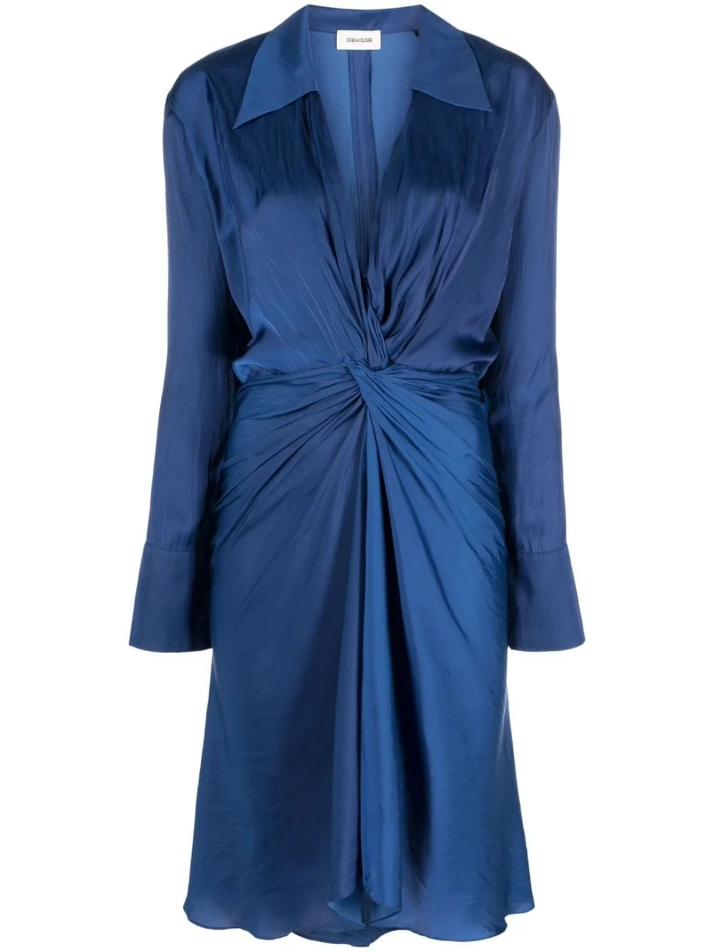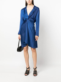 Rozo twisted V-neck midi dress Highlights - Royal blue - Recycled polyester blend - Satin finish - Twist detailing - Ruched detailing - Spread collar - V-neck - Long sleeves - Concealed rear zip fastening - Asymmetric hem - Knee-length Imported Composition Recycled Polyester 57%, Polyester 43% SIZE & FIT Model measurements Height 5 ft 11 in(1.8 m) Bust/Chest 31.49 in(80 cm) Hips 36.22 in(92 cm) Waist 25.59 in(65 cm) FittingInformation Designed for a loose fit at the chest with a close fit over the waist and hips Made from a lightweight non-stretch fabric This piece fits true to size – take your usual size
