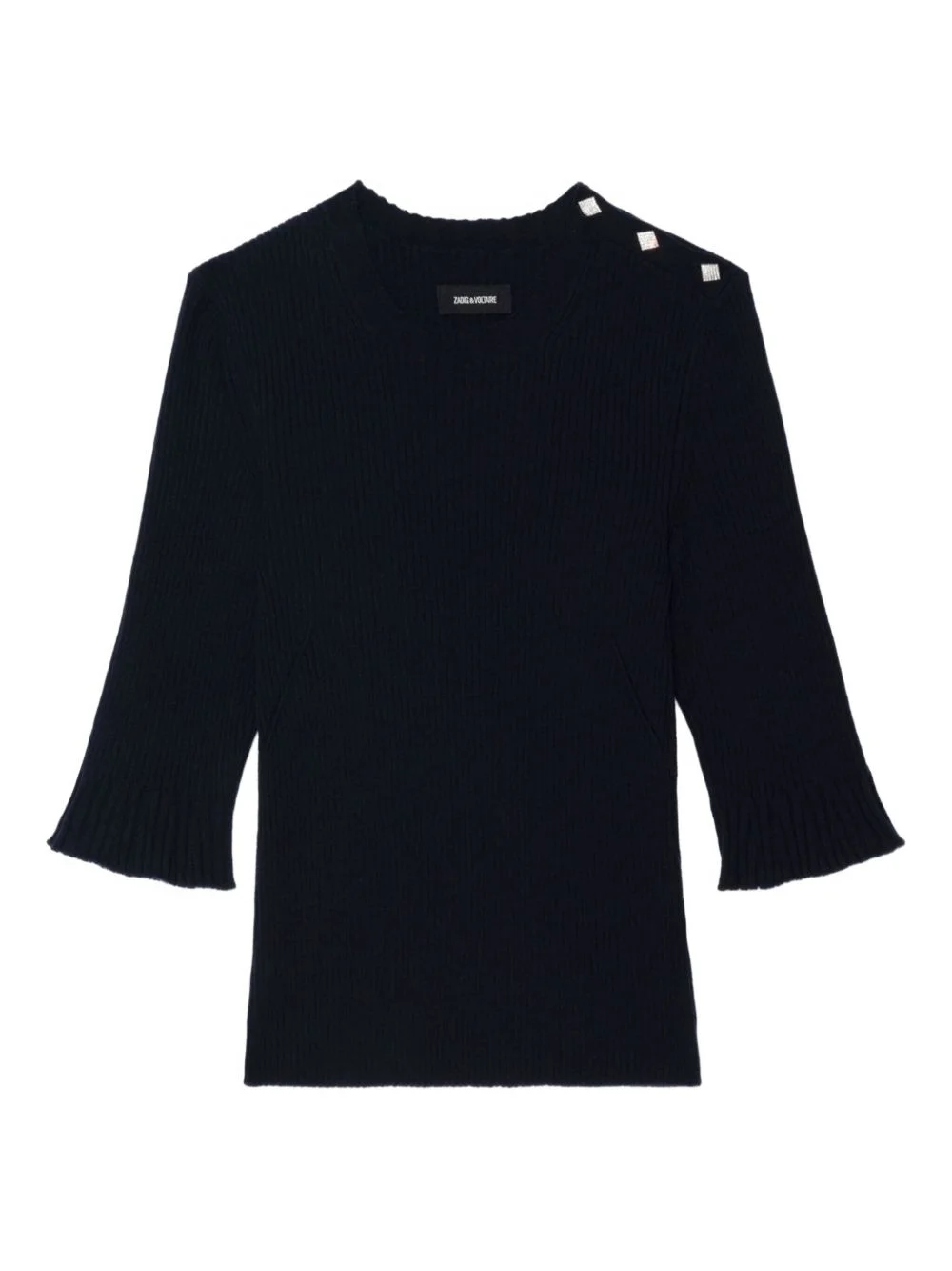 short-sleeve ribbed T-shirt Highlights - Blue - Ribbed knit - Three-quarter sleeves - Ruffled cuffs - Shoulder embellishment - Round neck Imported Composition Fabric 100% Washing instructions Hand Wash