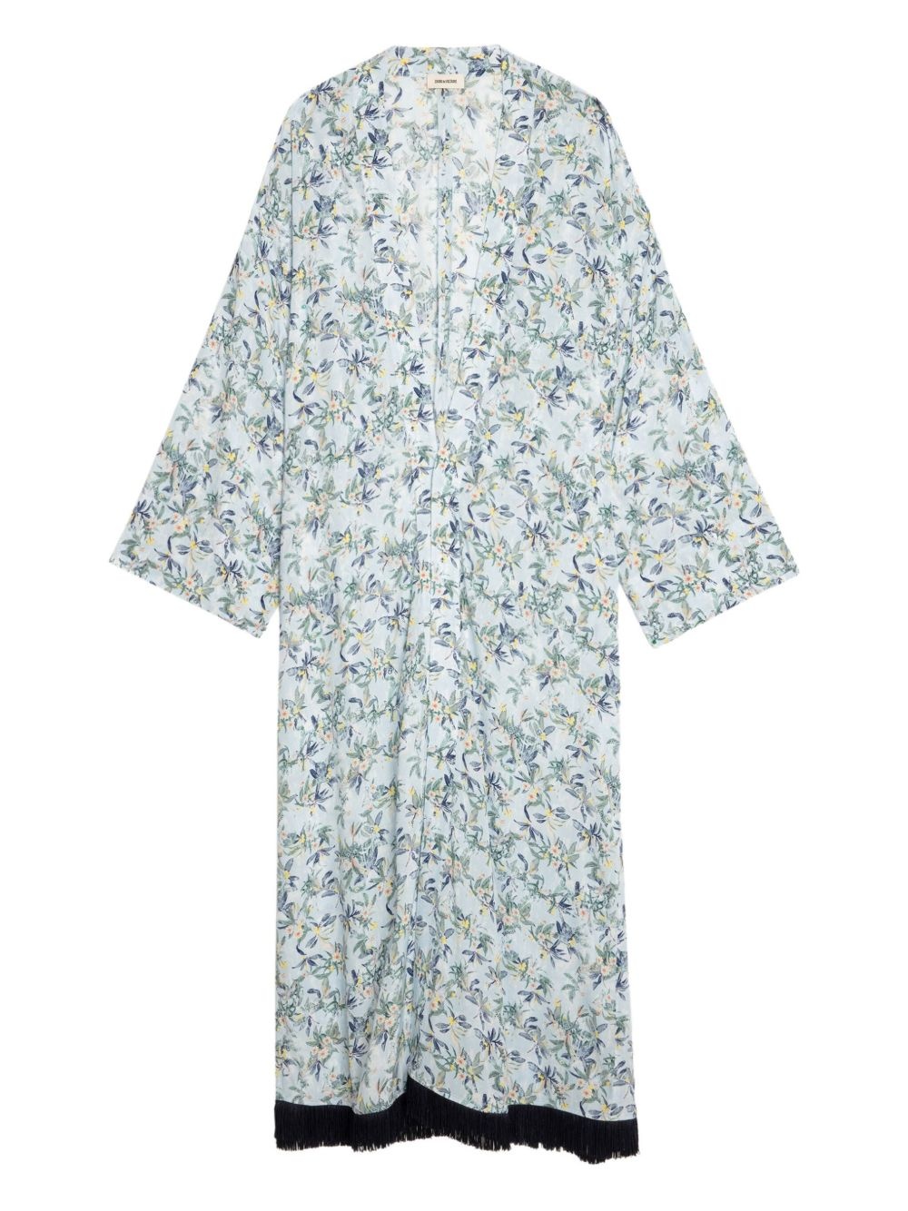 silk coat Highlights - Sky blue - Fringed edge - All-over floral print - Long sleeves Imported Composition Silk 100%