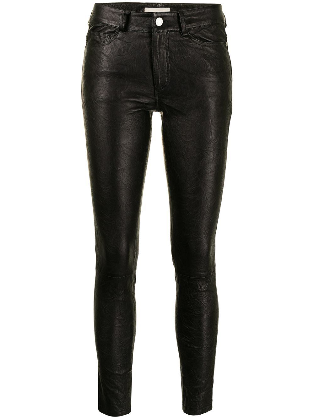 skinn lambskin trousers black lambskin cracked texture front button and zip fastening belt loops classic five pockets skinny cut Imported Composition Lamb Skin 100% SIZE & FIT Model measurements Height 5 ft 9 in(1.76 m) Bust/Chest 29.13 in(74 cm) Hips 33.07 in(84 cm) Waist 22.83 in(58 cm) FittingInformation This piece fits true to size. We recommend you get your regular size Cut for a close fit Made with a mid-weight non-stretch fabric Washing instructions Dry Clean Only