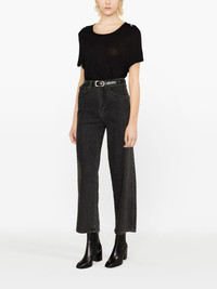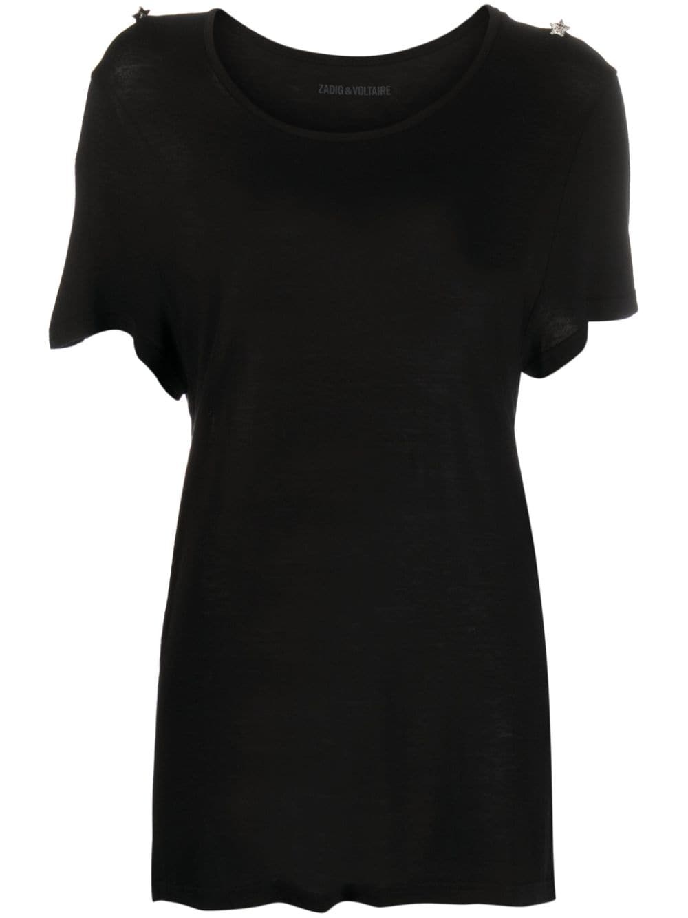 star-embellished top Featuring silver-tone star embellishments at the shoulders, this black top from Zadig&Voltaire exhibits the brand's details-oriented approach to design. It's cut to a relaxed silhouette with a scoop neck and short sleeves. Highlights - Black - Round neck - Star stud embellishment - Ruffled short sleeves - Straight hem Imported Composition Viscose 85%, Wool 15% SIZE & FIT Model measurements Height 5 ft 10 in(1.79 m) Bust/Chest 31.49 in(80 cm) Hips 35.03 in(89 cm) Waist 23.62 in(60 cm) FittingInformation Designed for a slim fit that sits just away from the body offering a close yet comfortable fit Made from a midweight non-stretch fabric, this piece offers minimal elasticity when worn This piece fits true to size – take your usual size Washing instructions Hand Wash