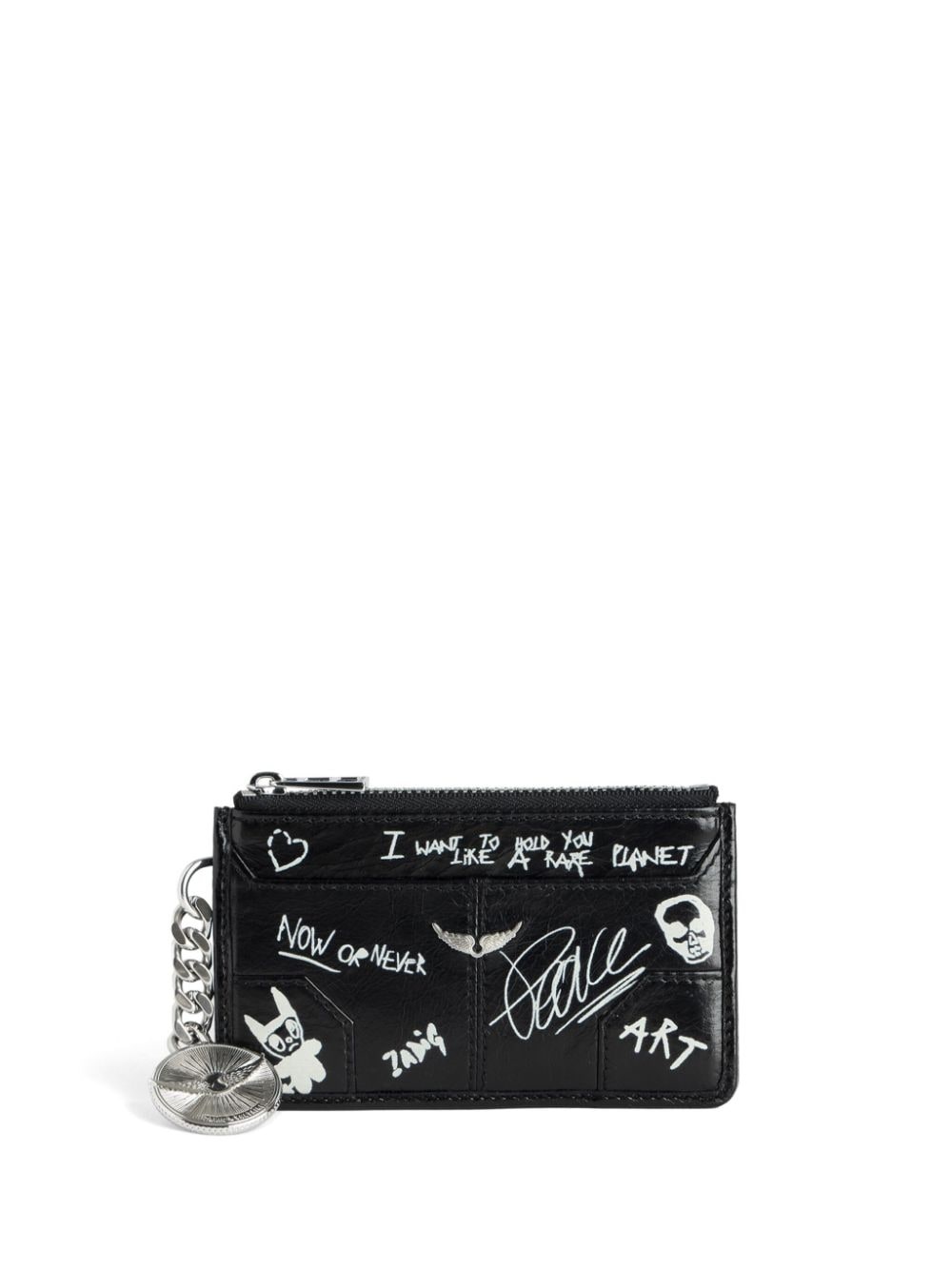 Sunny card holder Highlights - Black - Calf leather - Patent finish - Illustration-style print - Zip-fastening compartment - Wings-logo charm - Medallion pendant - Chain-link trim - Slip pocket to the front and rear - Four rear card slots Imported Composition Outer: Calf Leather 100% SIZE & FIT Measurement LENGTH 5.11 in(13 cm) WIDTH 2.95 in(7.5 cm)