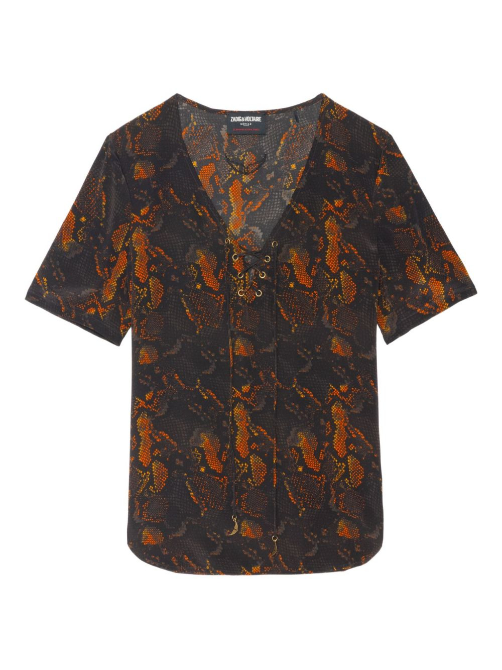 Terzo blouse Highlights - Black and multicolour - Python print - V-neck - Lace-up detail - Short sleeves Imported Composition Silk 100% Washing instructions Hand Wash