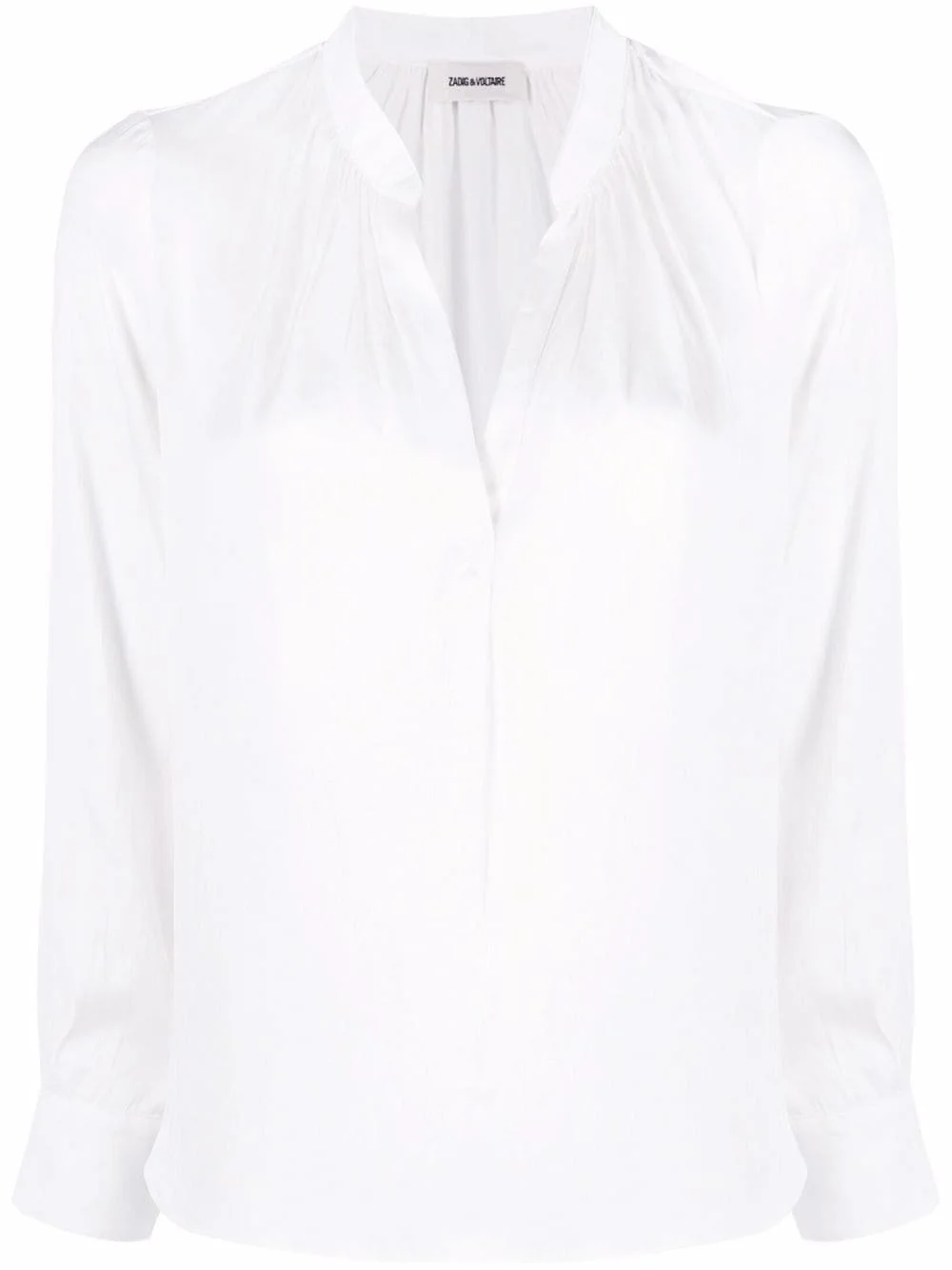 Tink tunic blouse Crafted from a lightweight material with a satin finish, this delicate blouse from Zadig&Voltaire boasts subtle pleats, complementing its lustrous construction. Highlights - White - Pleat detailing - Satin finish - V-neck - Collarless - Long puff sleeves - Buttoned cuffs - Curved hem Imported Composition Polyester 100% Washing instructions Hand Wash