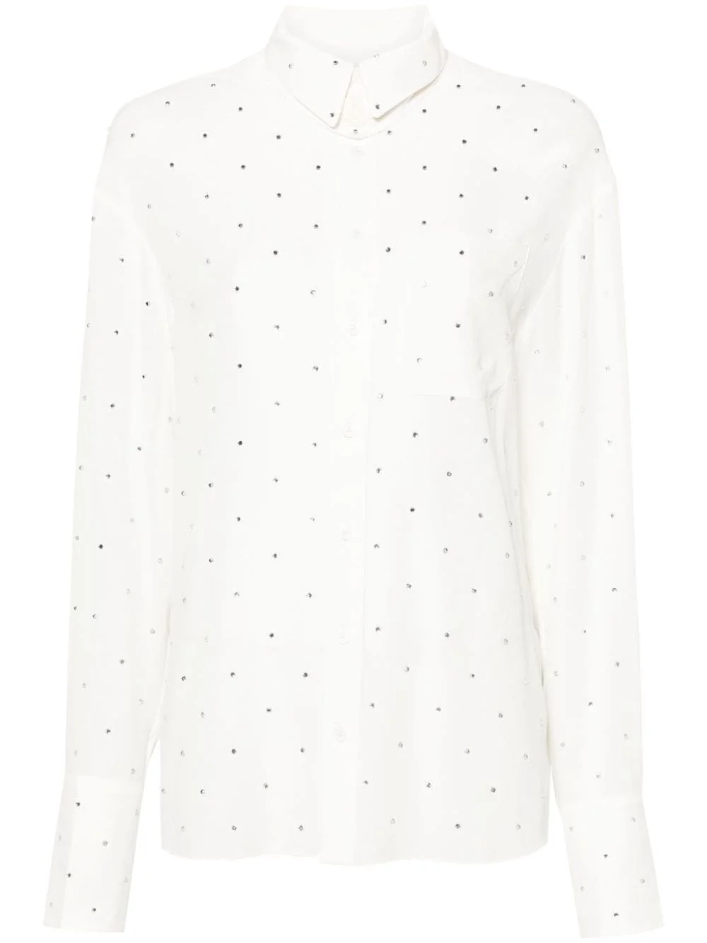 Tyrone silk shirt Highlights - Ivory white - Silk - Rhinestone embellishment - Embroidered logo to the side - Detachable panel - Classic collar - Front button fastening - Drop shoulder - Long sleeves with buttoned cuffs - Chest patch pocket - Curved hem Imported Composition Silk 100%, Mother of Pearl 100% SIZE & FIT Model measurements Height 5 ft 10 in(1.77 m) Bust/Chest 32.28 in(82 cm) Hips 35.03 in(89 cm) Waist 25.19 in(64 cm) FittingInformation Designed for a relaxed fit, this piece allows for comfort and movement when worn Made from a lightweight non-stretch fabric This piece fits true to size – take your usual size